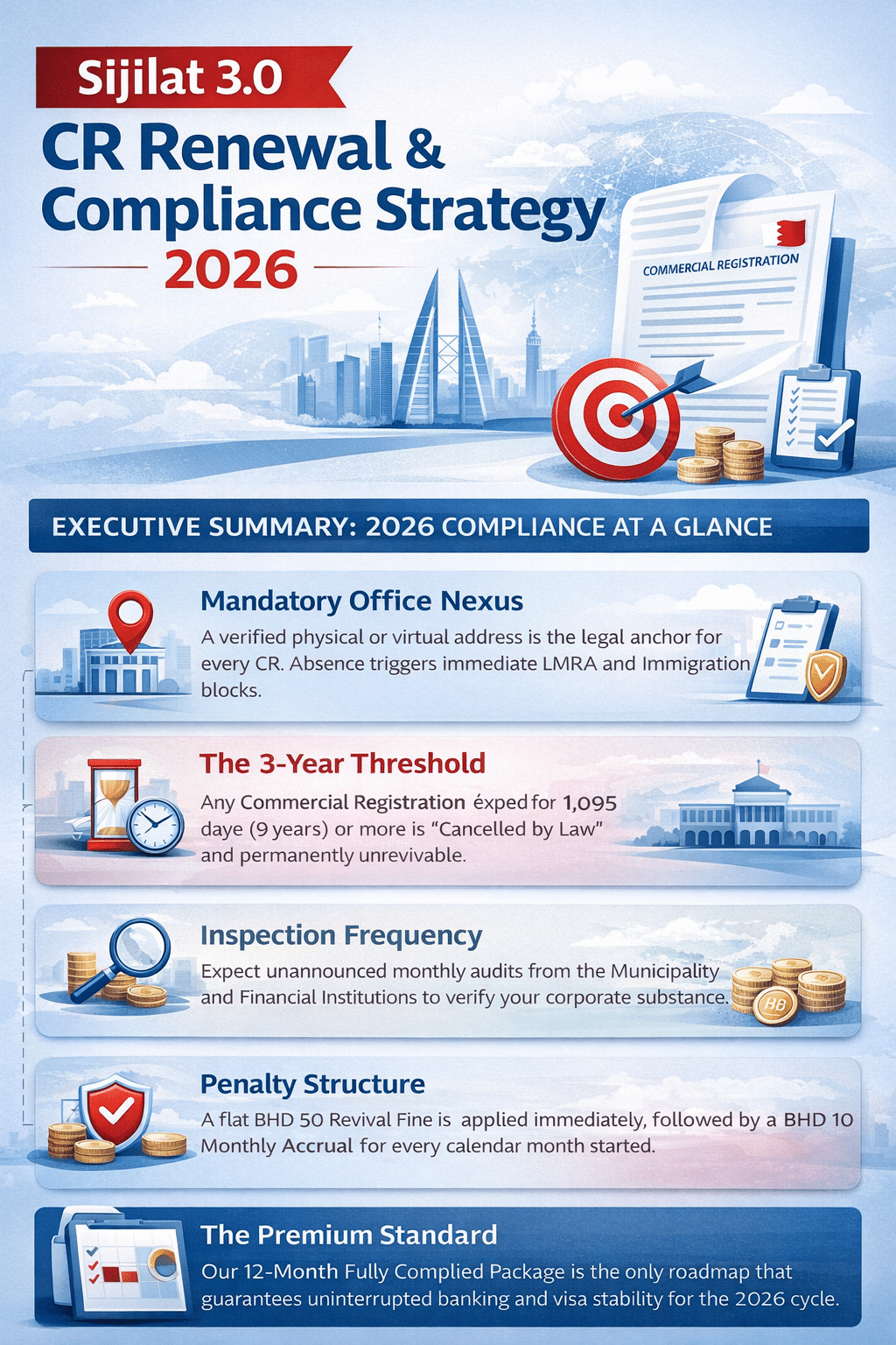 The cost of delay is not just the BHD 10 monthly penalty—it is the risk of a permanent “Commercial Strike” against your profile. Every day your CR remains in “Expired” or “Red Status,” you are vulnerable to inspections from Immigration and Financial Institutions.